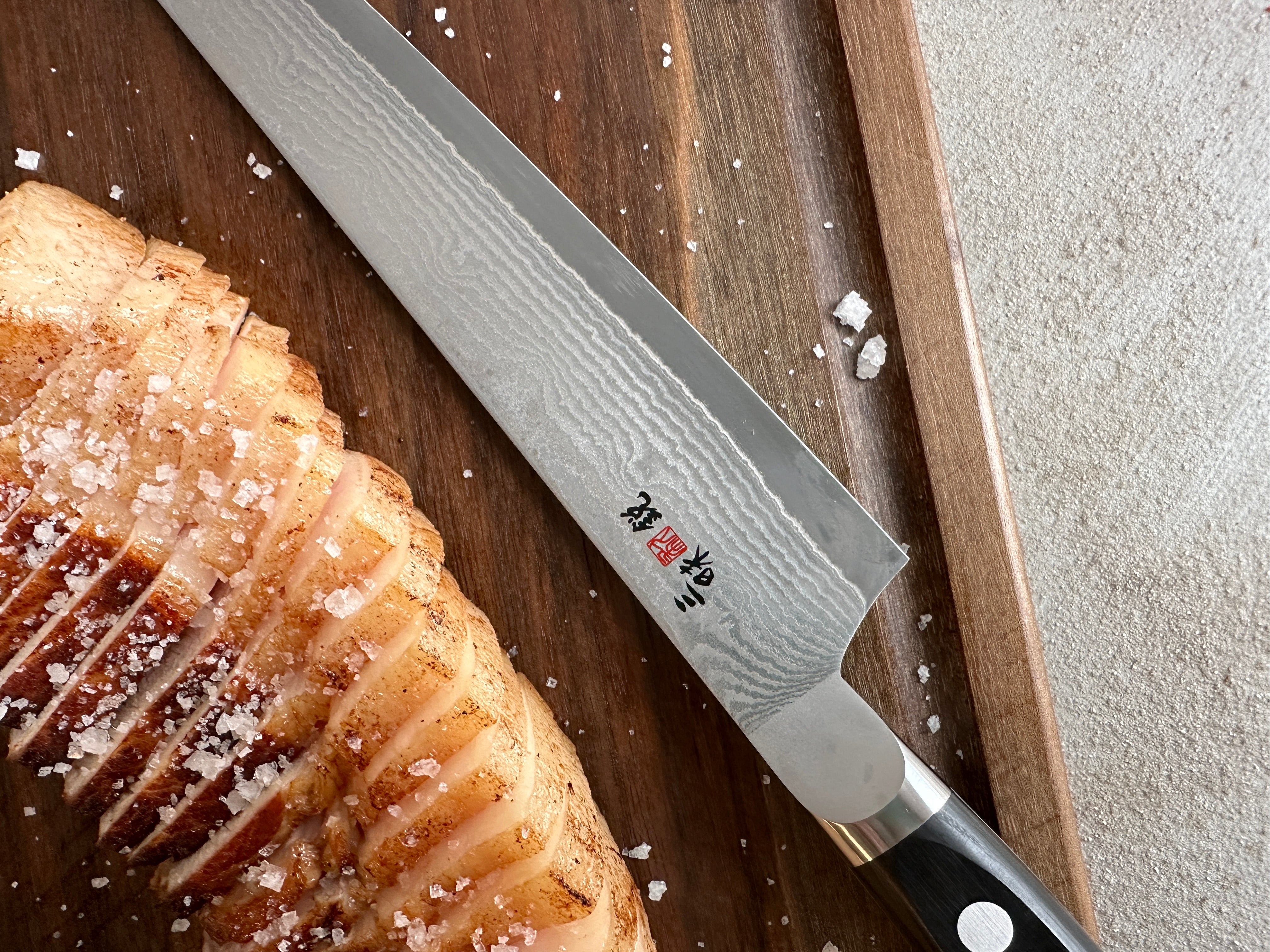 Daljši slicer (nož za razrez mesa/rib) z gladko preciznostjo zdrsi skozi meso in ustvarja popolne rezine.